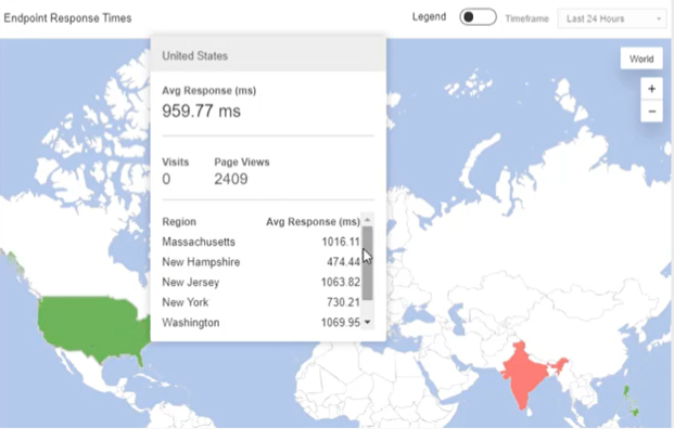 With employees working remotely from different locations, it also helps to break down the data by location and compare performance based on the employee location. For example, in the map below, users in India are facing higher response times for a specific application. The data can be further analyzed by the network type used by the employee so you can determine if the issue is caused by a specific ISP or if it is specific to the device used by the employee.