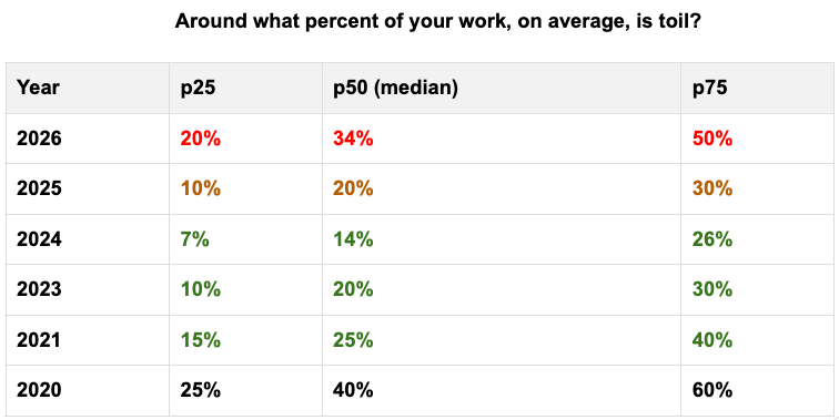 One of the most stable questions in the survey asks respondents to estimate how much of their work, on average, is spent on toil.