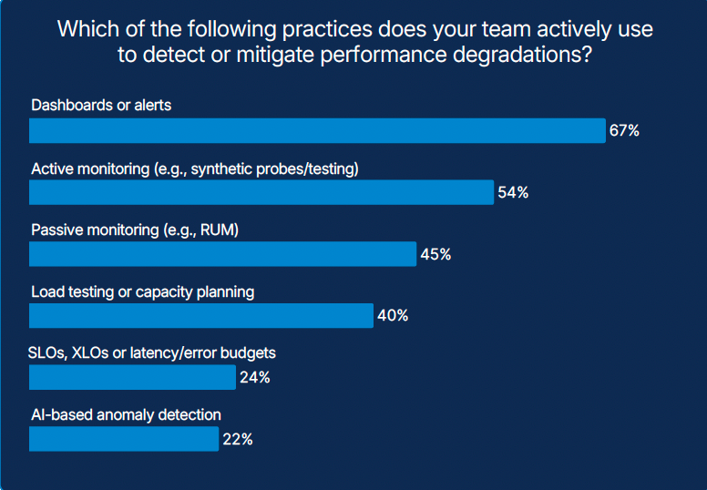 The fact that most teams have mature dashboards and synthetic tests tells its own story.