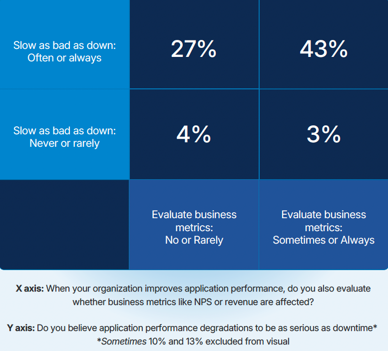 - 43%: Belief plus behavior. They often or always treat slow as bad as down and also check business metrics sometimes or always.