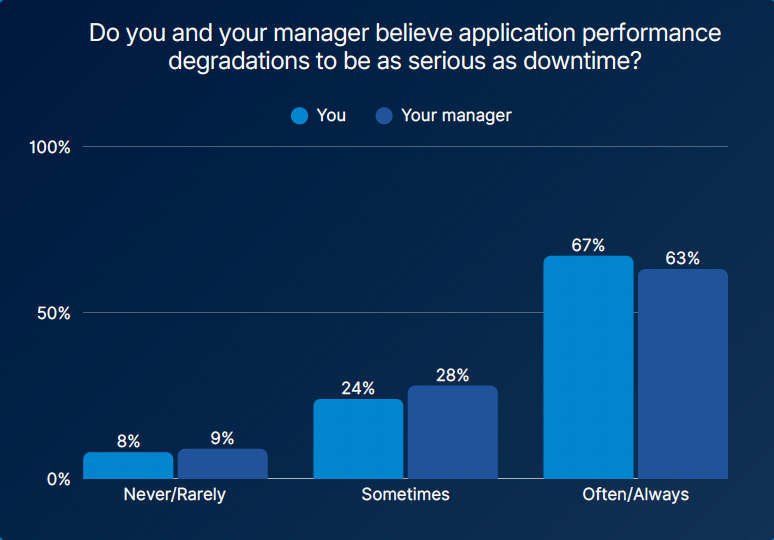Across two years of data, one message holds steady: slow apps are dead apps. In last year’s report, a majority of organizations (53%) agreed with the phrase “slow is the new down,” even though many had never heard it before. In the 2026 report, 67% of respondents agreed that performance degradation is as serious as downtime. That belief has settled.