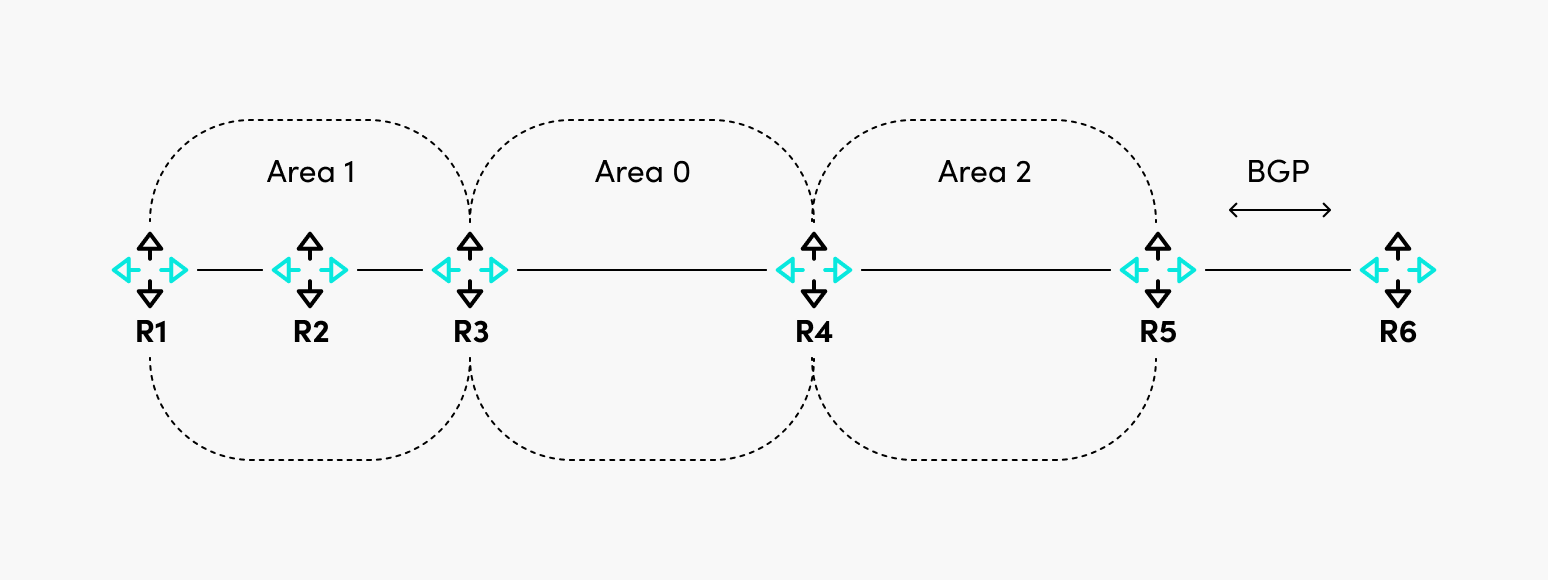 - R5: Autonomous System Border Router, which redistributes external routes (BGP) in OSPF.