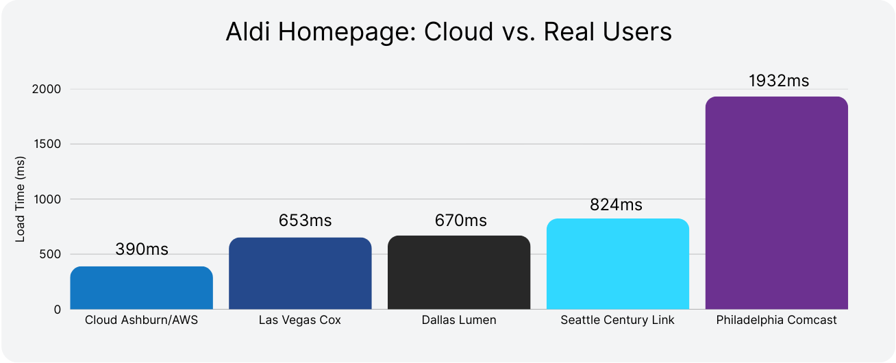 Aldi’s homepage shows a crystal-clear “Cloud vs. Real Users” story. From a U.S. cloud vantage point, it looks like the site loads in under half a second — but real customers wait 2-5× longer depending on their ISP or access type.