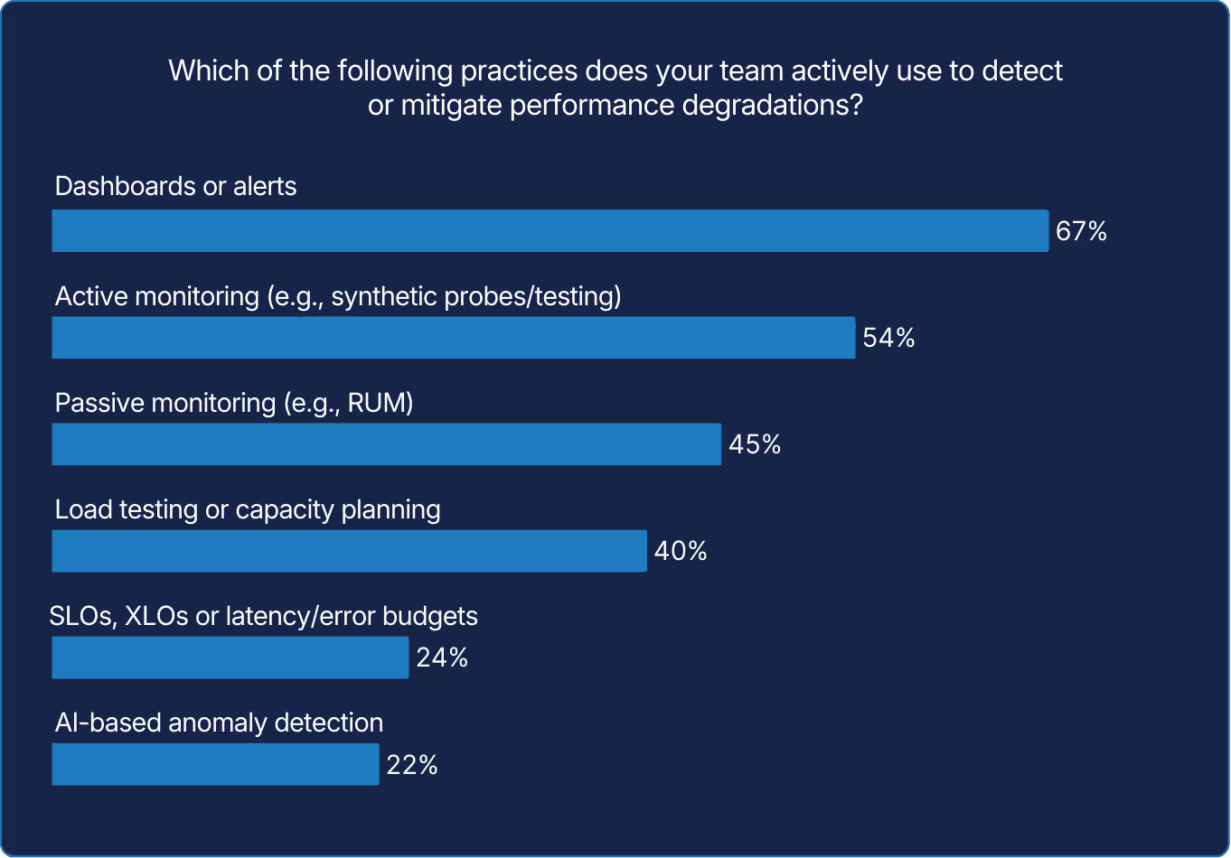 Still, awareness isn’t alignment. Only a quarter of organizations consistently evaluate whether application performance improvements affect business metrics like NPS or revenue. Teams that link reliability to outcomes are turning it from an operational task into a competitive advantage in the business of being fast.