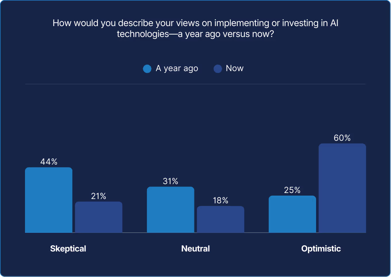Intent is rapidly becoming action. Experimentation with LLMs is evolving into broad adoption, as teams move beyond curiosity to real commitment. The next challenge is proving that AI agents can reliably deliver sustained business value, not just technical novelty.