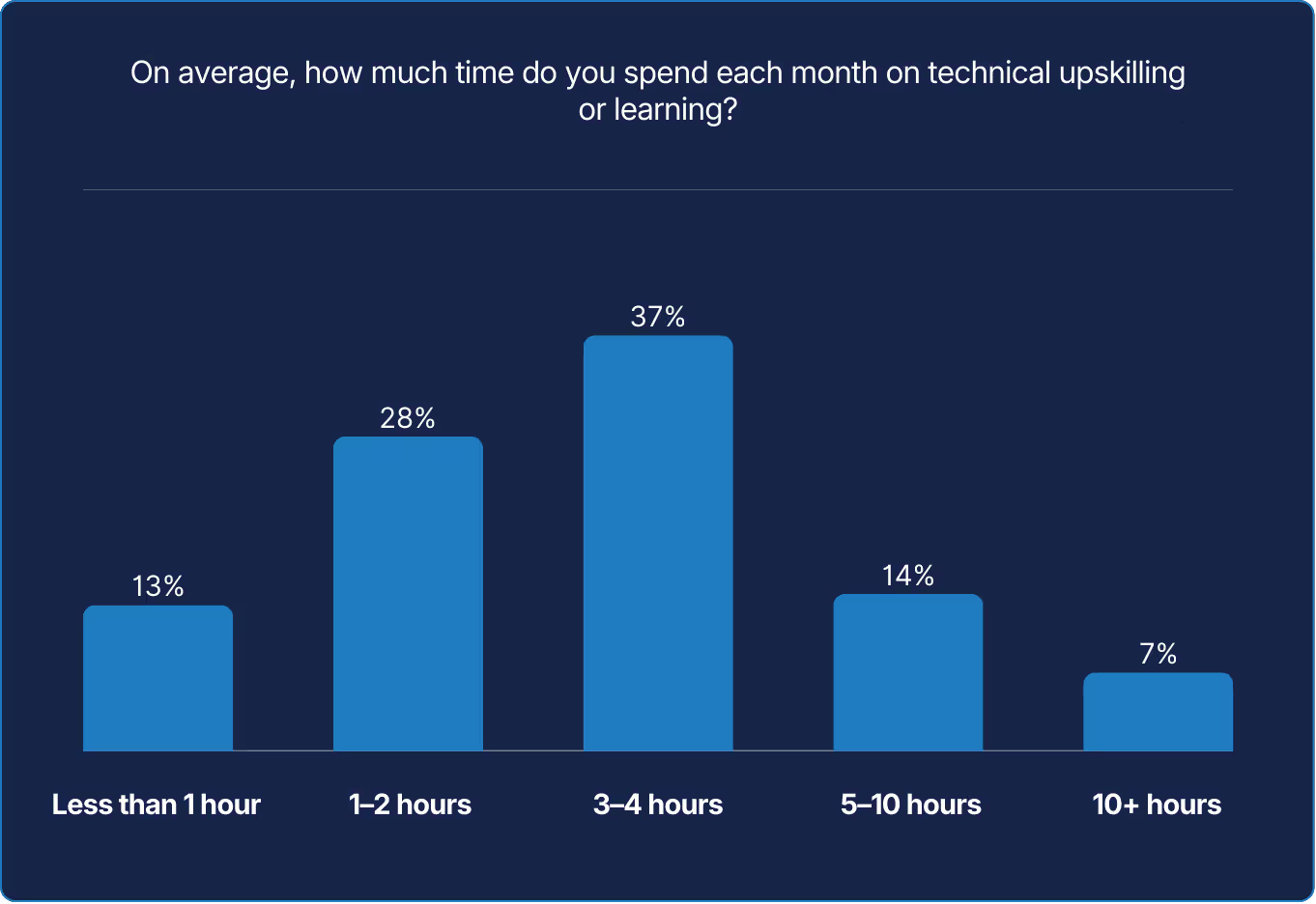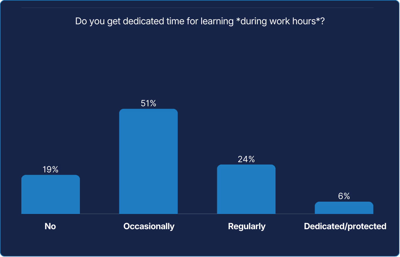 Systems evolve only as fast as the people maintaining them, yet the data reveals a troubling paradox. SREs know learning is essential, but few have the time or permission to pursue it. Most squeeze in a few hours a month, often after hours, in the margins of production. Only six percent say they have dedicated, protected learning time. That means in most organizations, curiosity runs on borrowed energy.