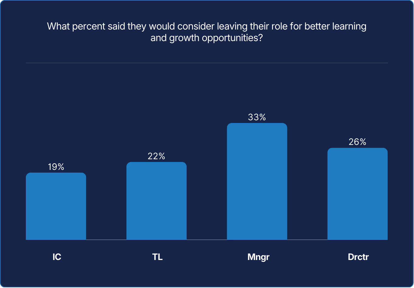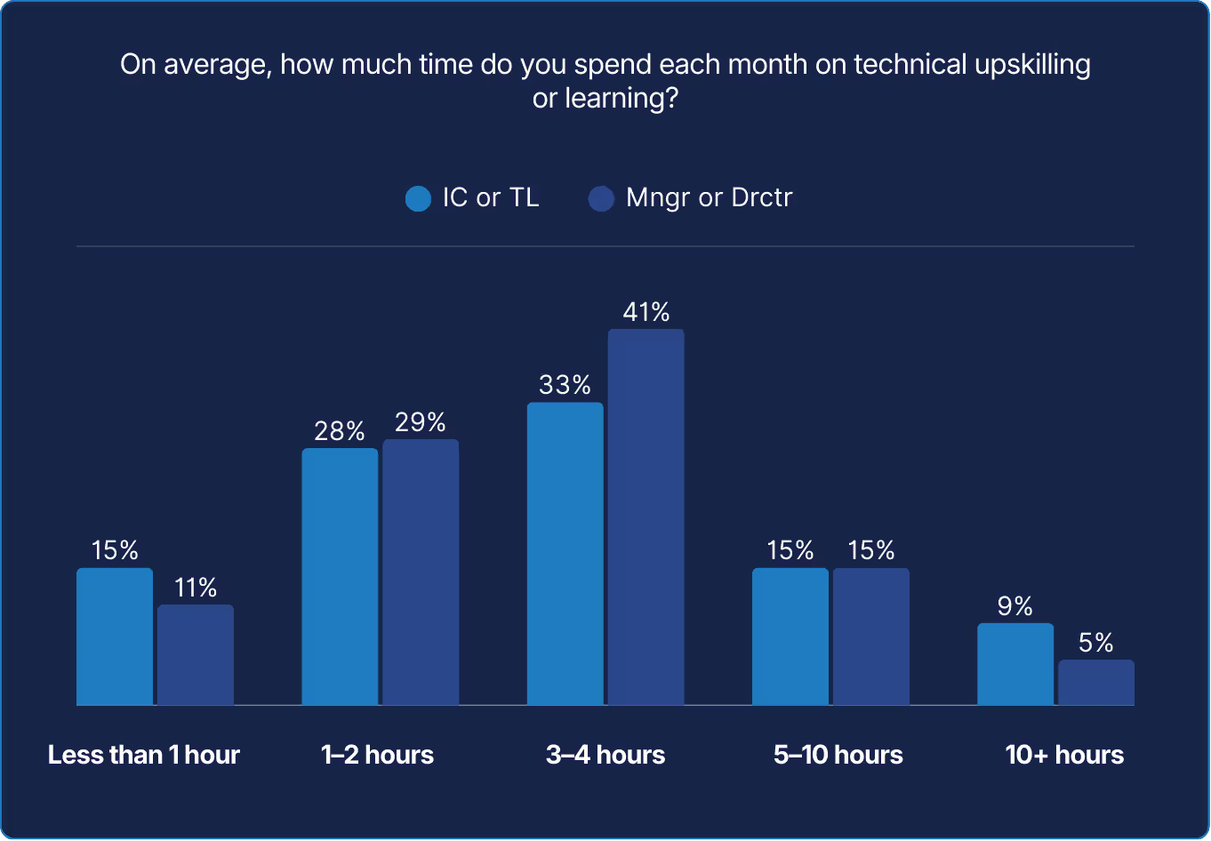 When asked what would make them leave, respondents didn’t just cite pay. Rather, they named growth, balance, and culture. That’s an important cultural insight, since those are reasons why employees would consider leaving. Maintaining systems is easier when engineers are regularly learning. Neglecting skill growth can leave teams exposed to challenges that become harder to solve over time.