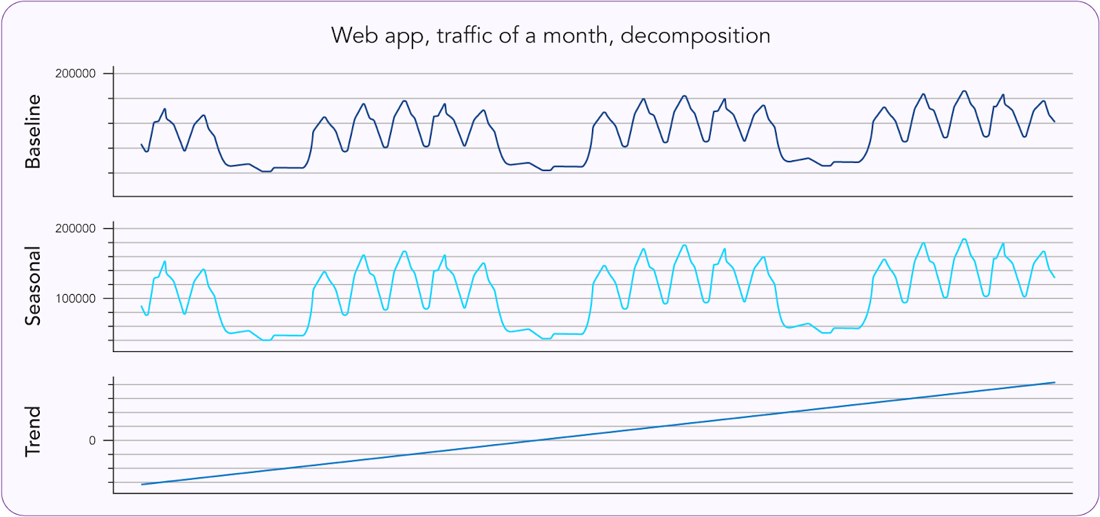 - Seasonality: Captures recurring, time-based patterns, such as time-of-day usage spikes, weekday vs. weekend behavior, or seasonal peaks that separate expected fluctuations from true anomalies.